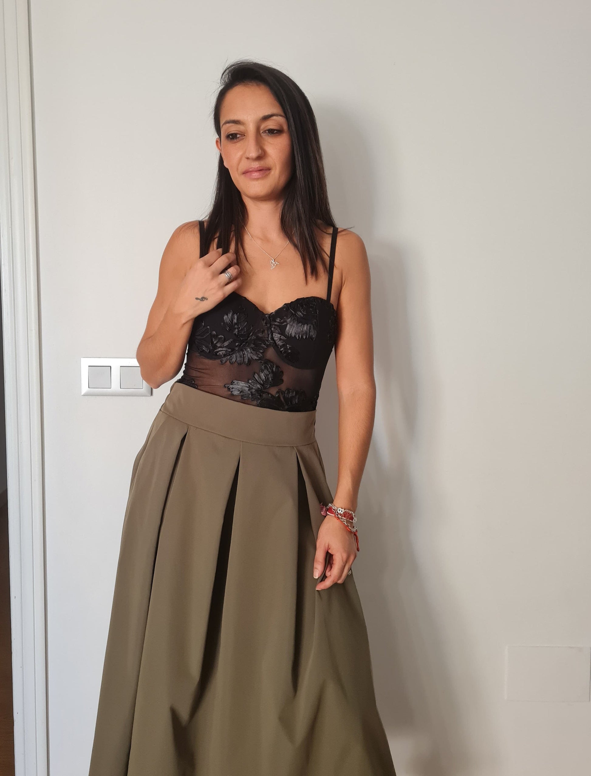 El Body Noir Bloom combina sensualidad y elegancia en una sola prenda. Su diseño con encaje floral y transparencias crea un efecto segunda piel ideal para elevar cualquier look. Perfecto para llevar con faldas, jeans de tiro alto o conjuntos dos piezas . Es el aliado infalible para tus noches más chic.