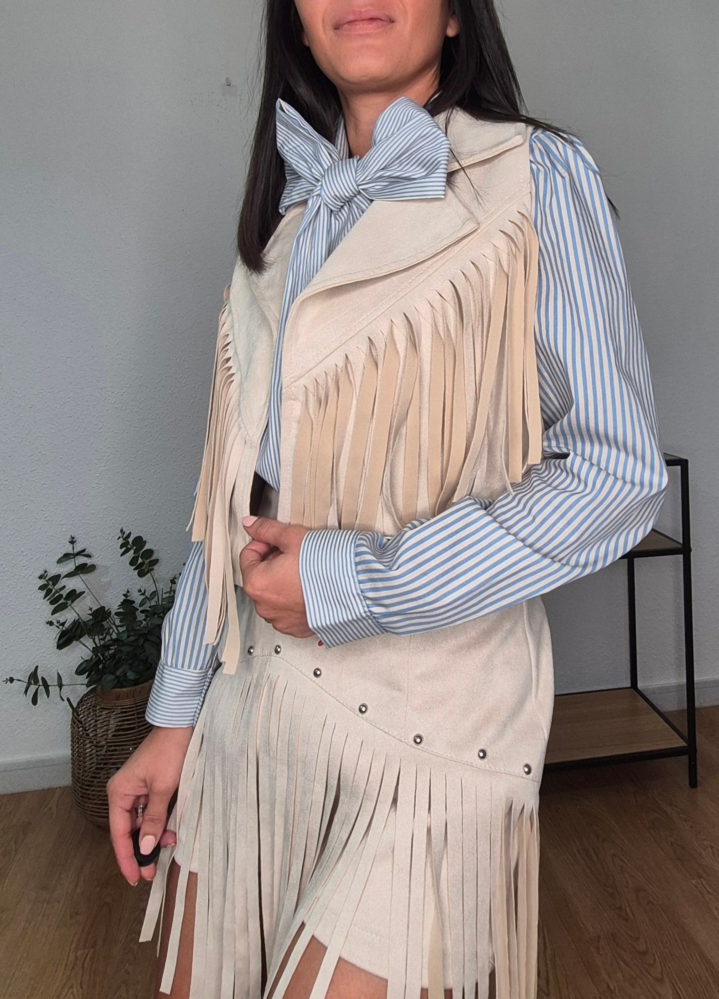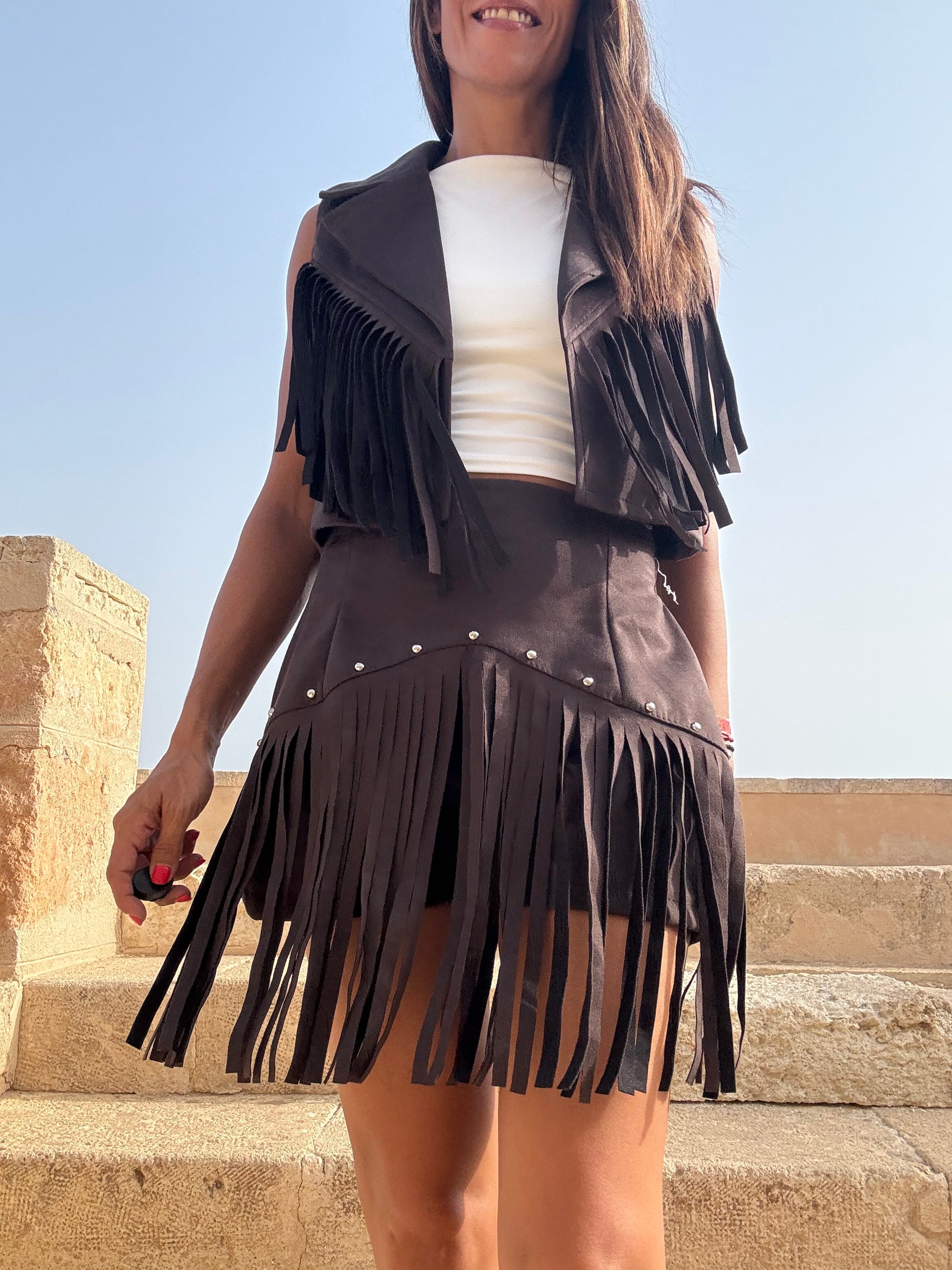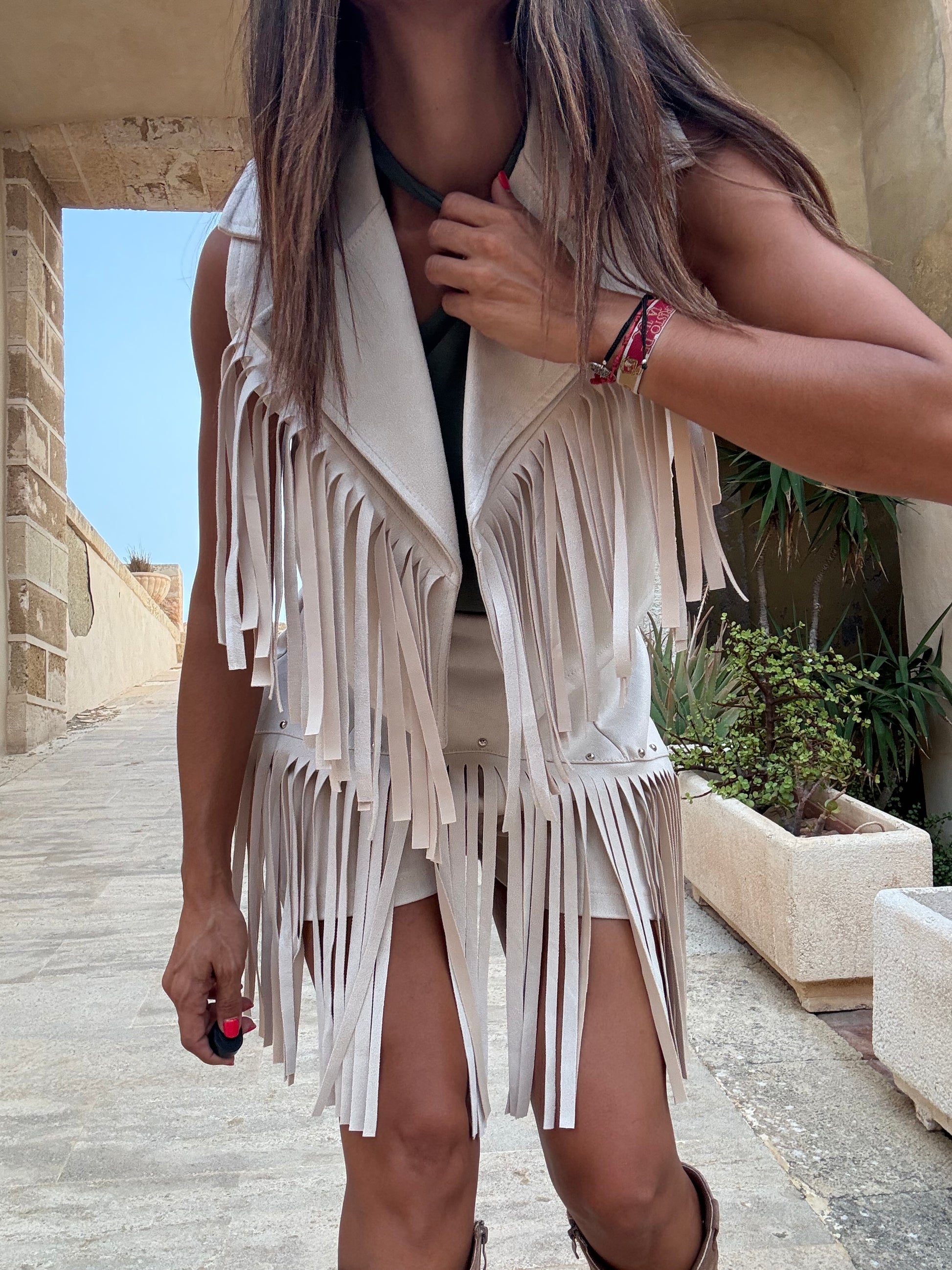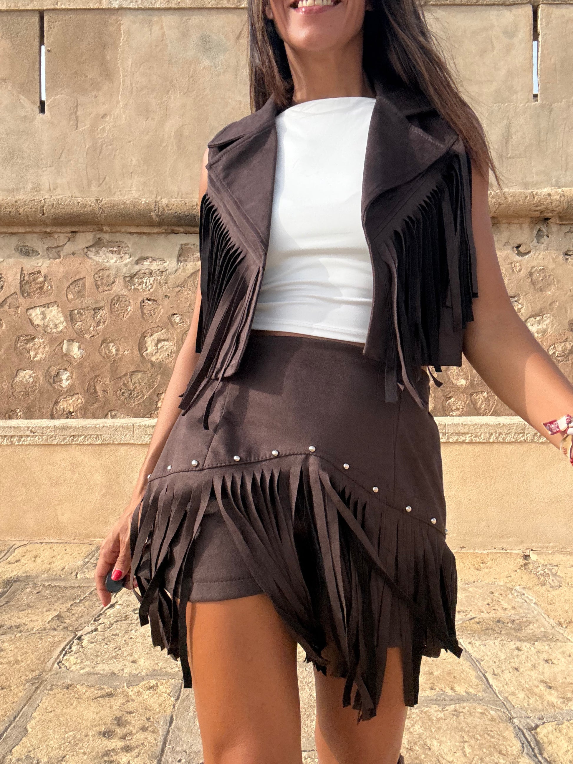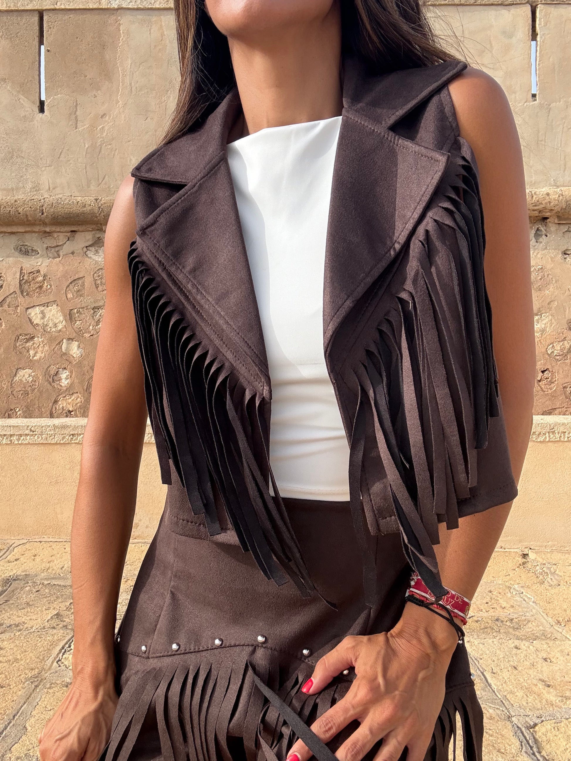 Chaleco de flecos con aire boho-western, disponible en beige y marrón chocolate. Una pieza atrevida y versátil que transforma cualquier look en pura actitud Aprile.