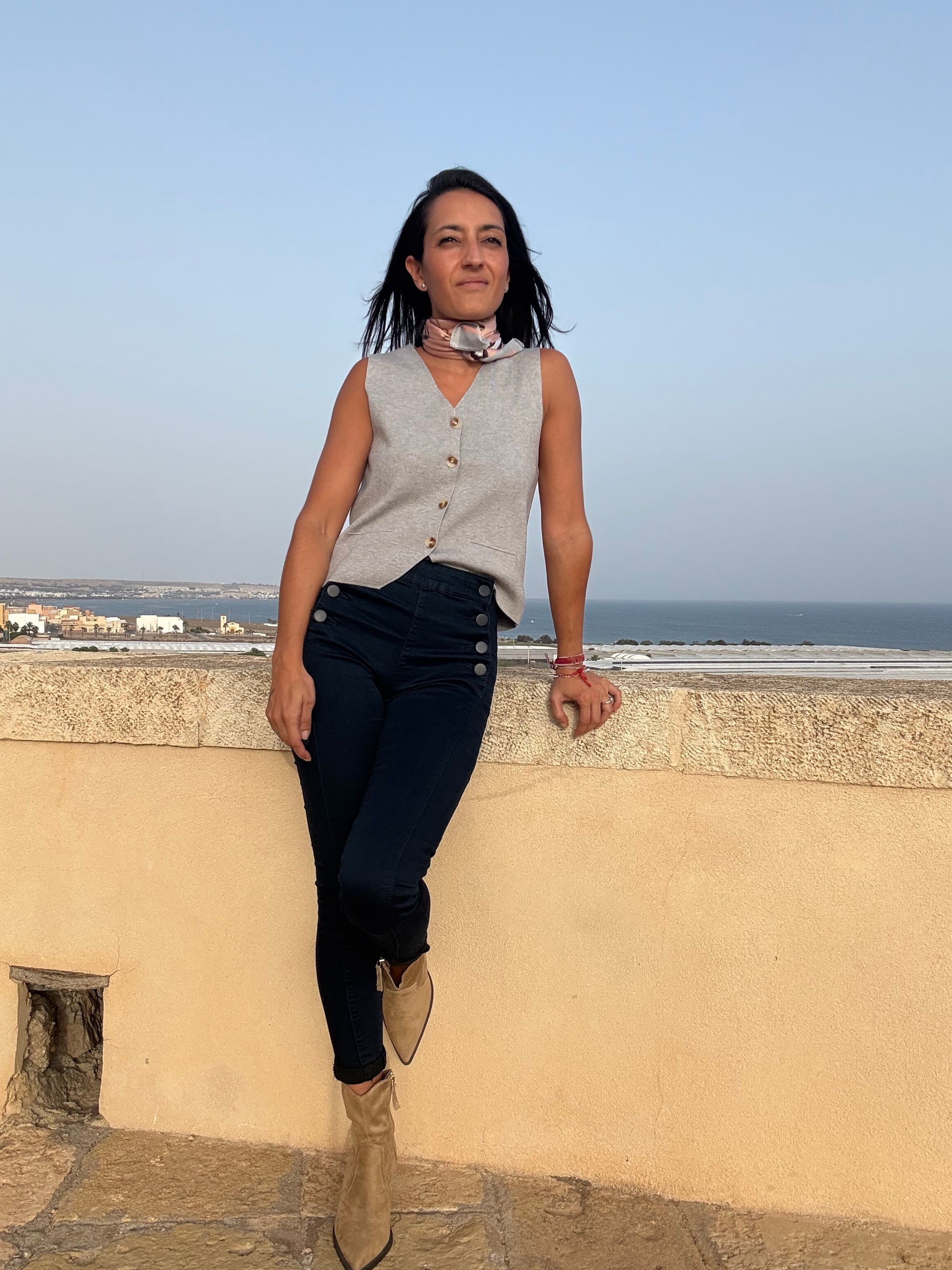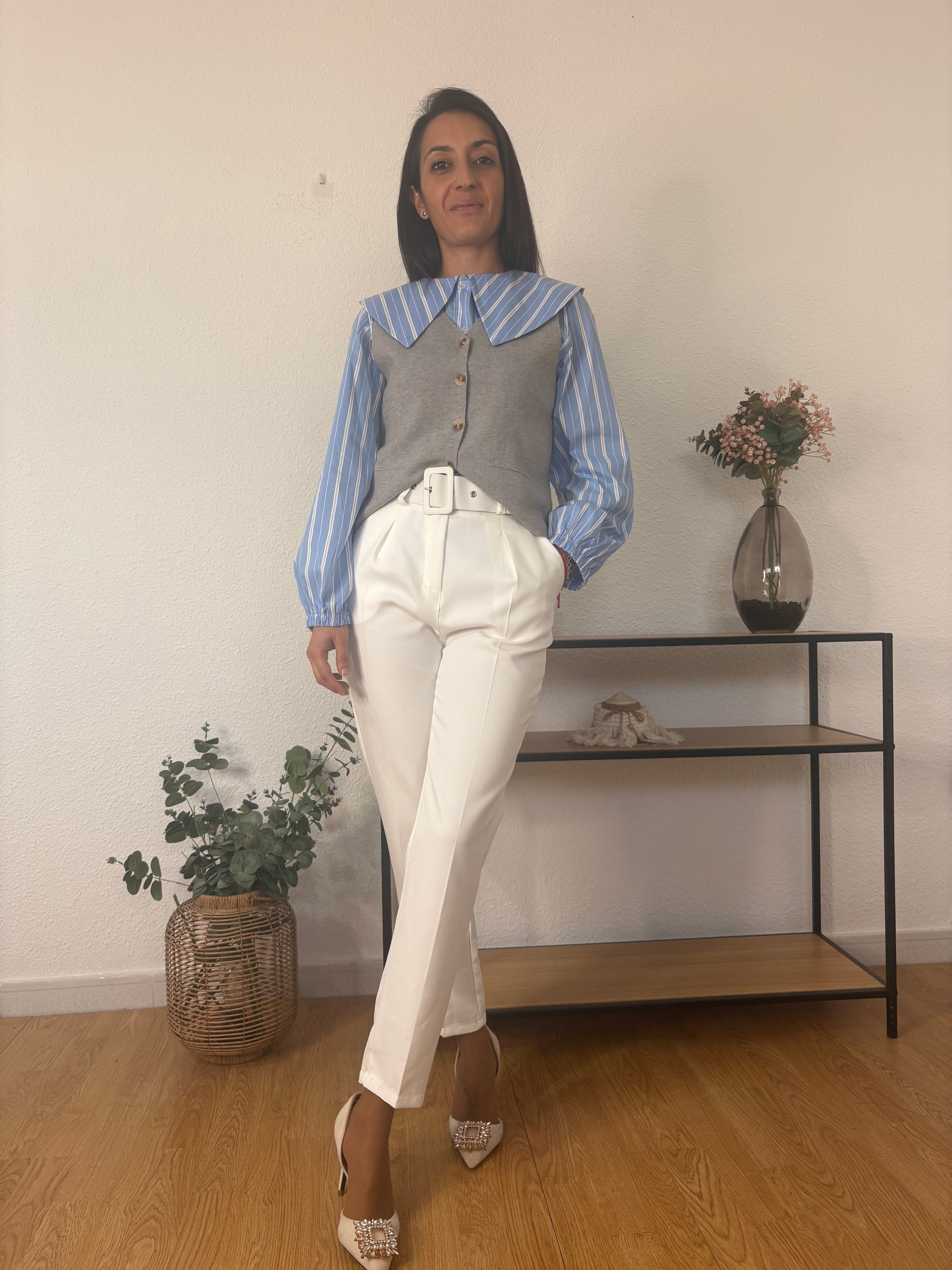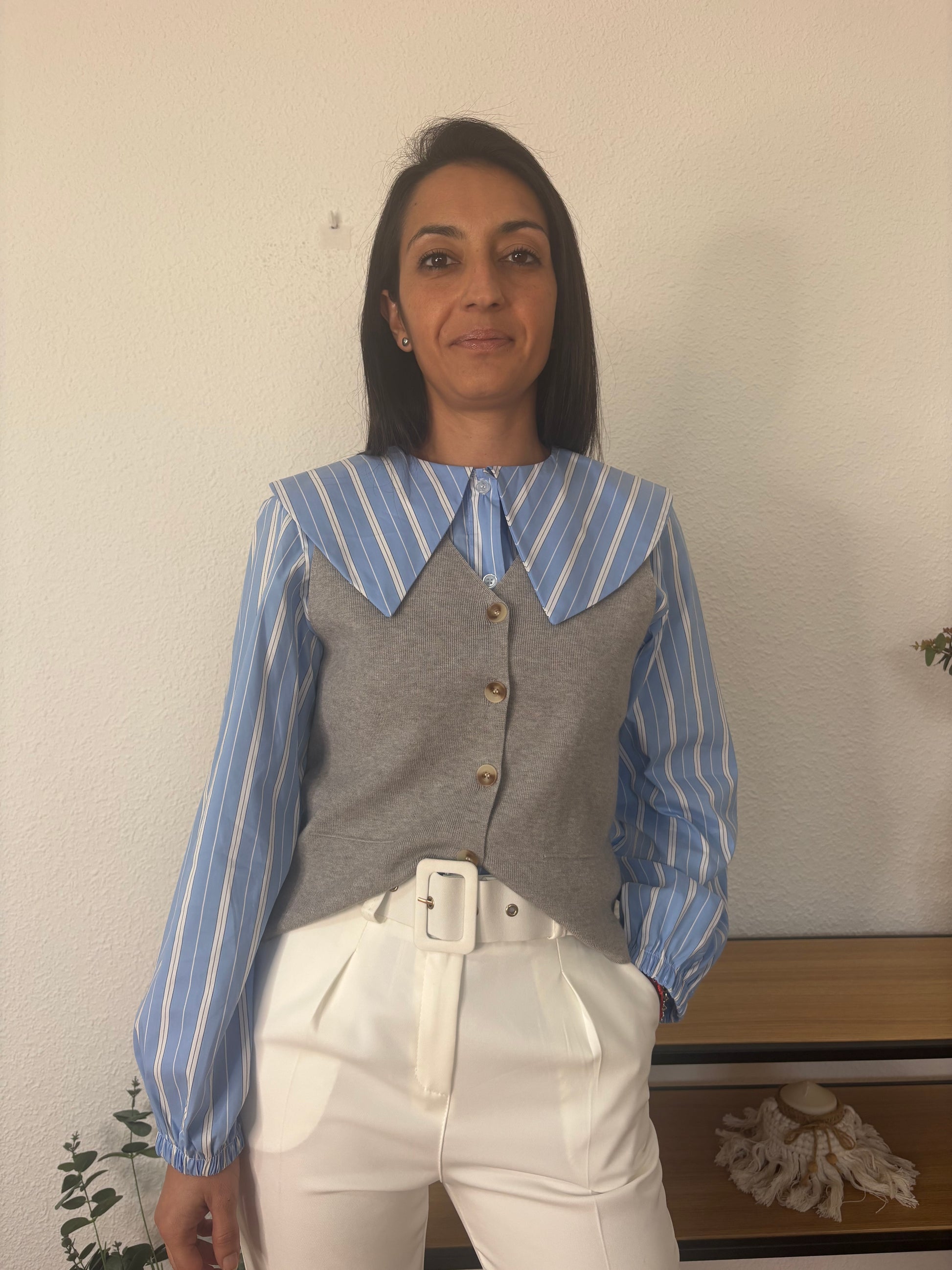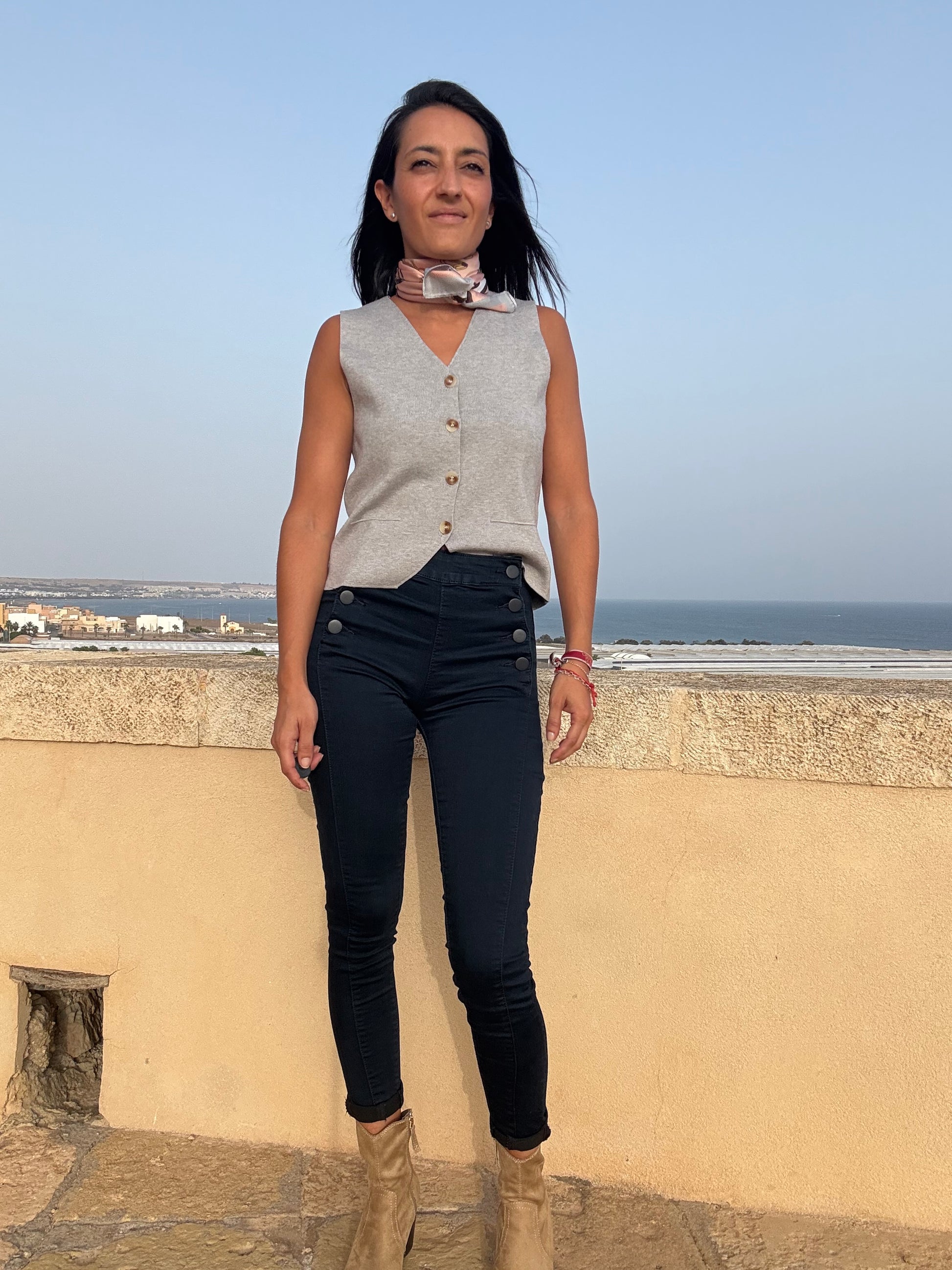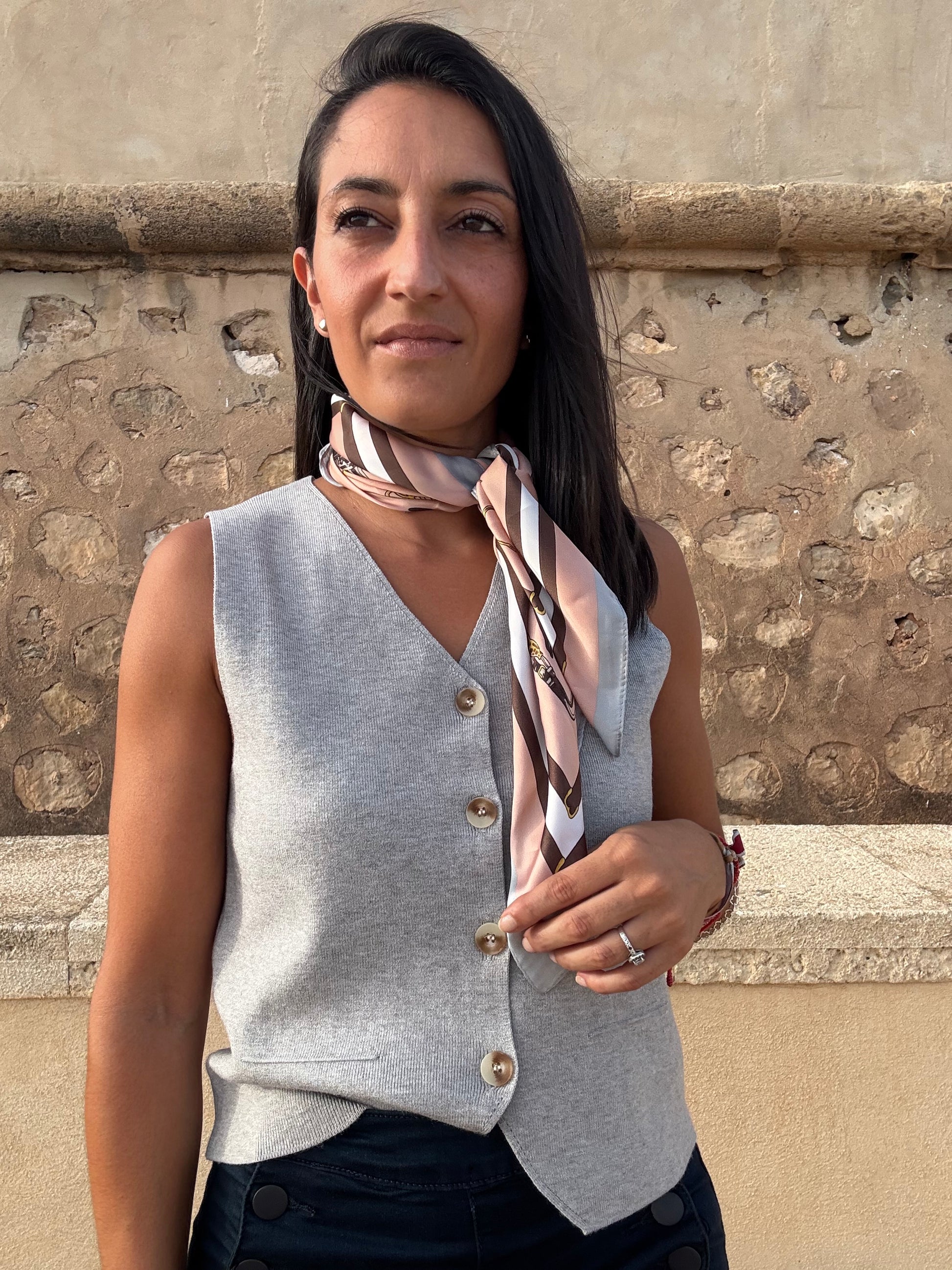 Chaleco de punto gris con botones delanteros y corte recto. Una prenda versátil y elegante que aporta un aire sofisticado a cualquier look. Llévalo solo para un estilo minimalista o combínalo con camisas y blusas para un outfit más chic.