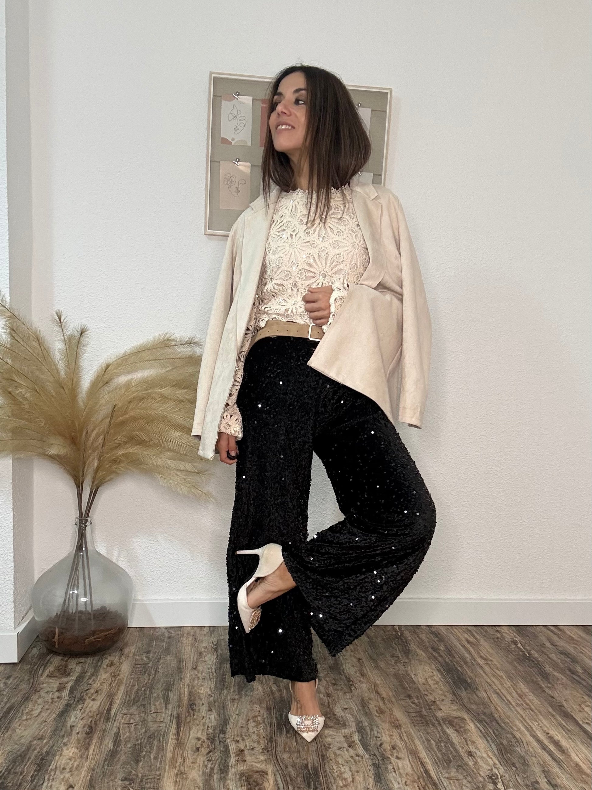 ¡Brilla sin límites! Este espectacular pantalón palazzo negro está cubierto de lentejuelas deslumbrantes.
