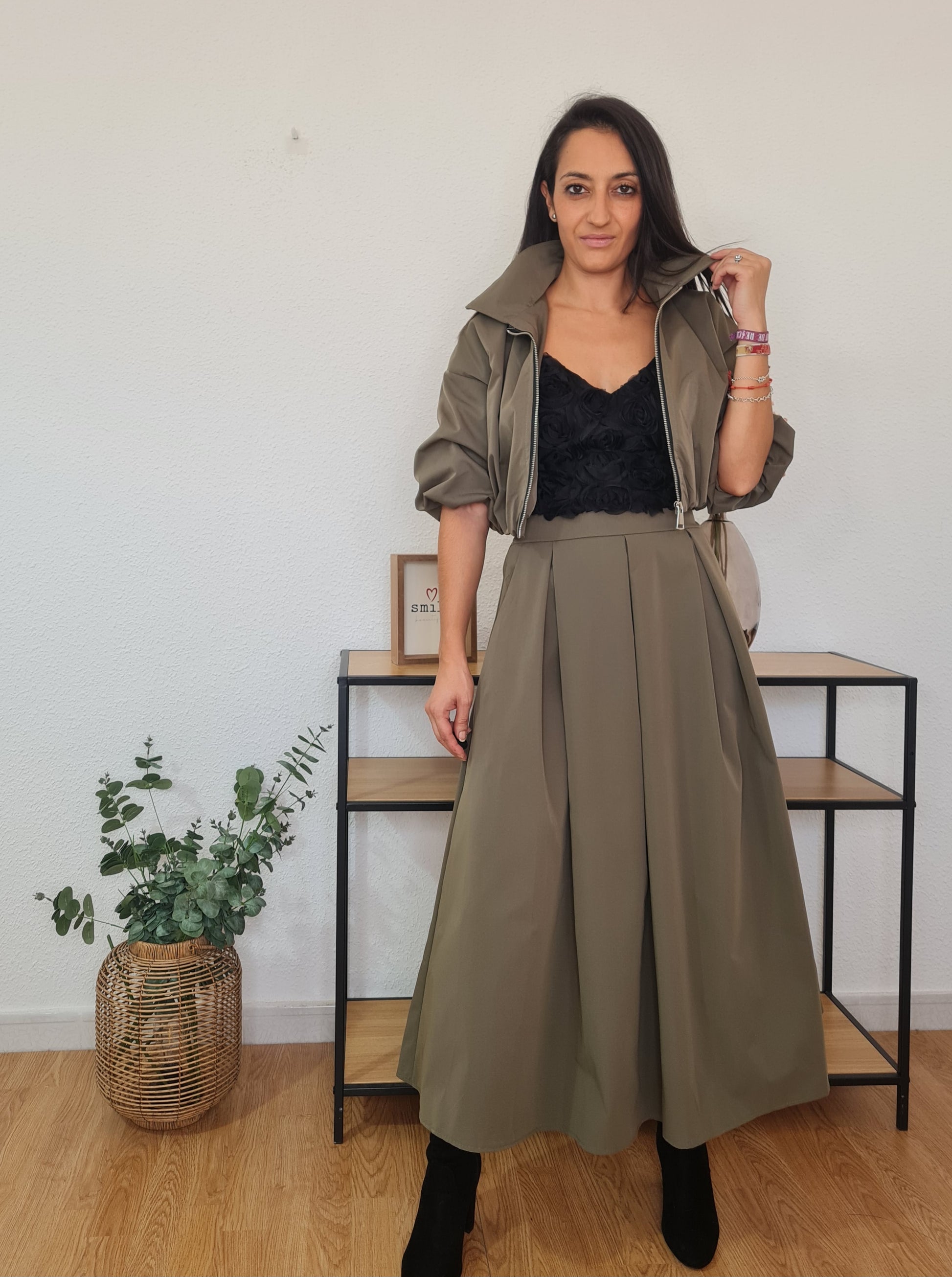 El conjunto Savona combina elegancia y estilo urbano en una sola prenda. Su chaqueta tipo bomber con volumen en las mangas y la falda midi de vuelo crean una silueta fluida, favorecedora y con mucho movimiento. El tono oliva aporta ese aire sofisticado y versátil que puedes llevar con botines o sneakers. Un look cómodo, actual y con el toque chic que distingue a Aprile.