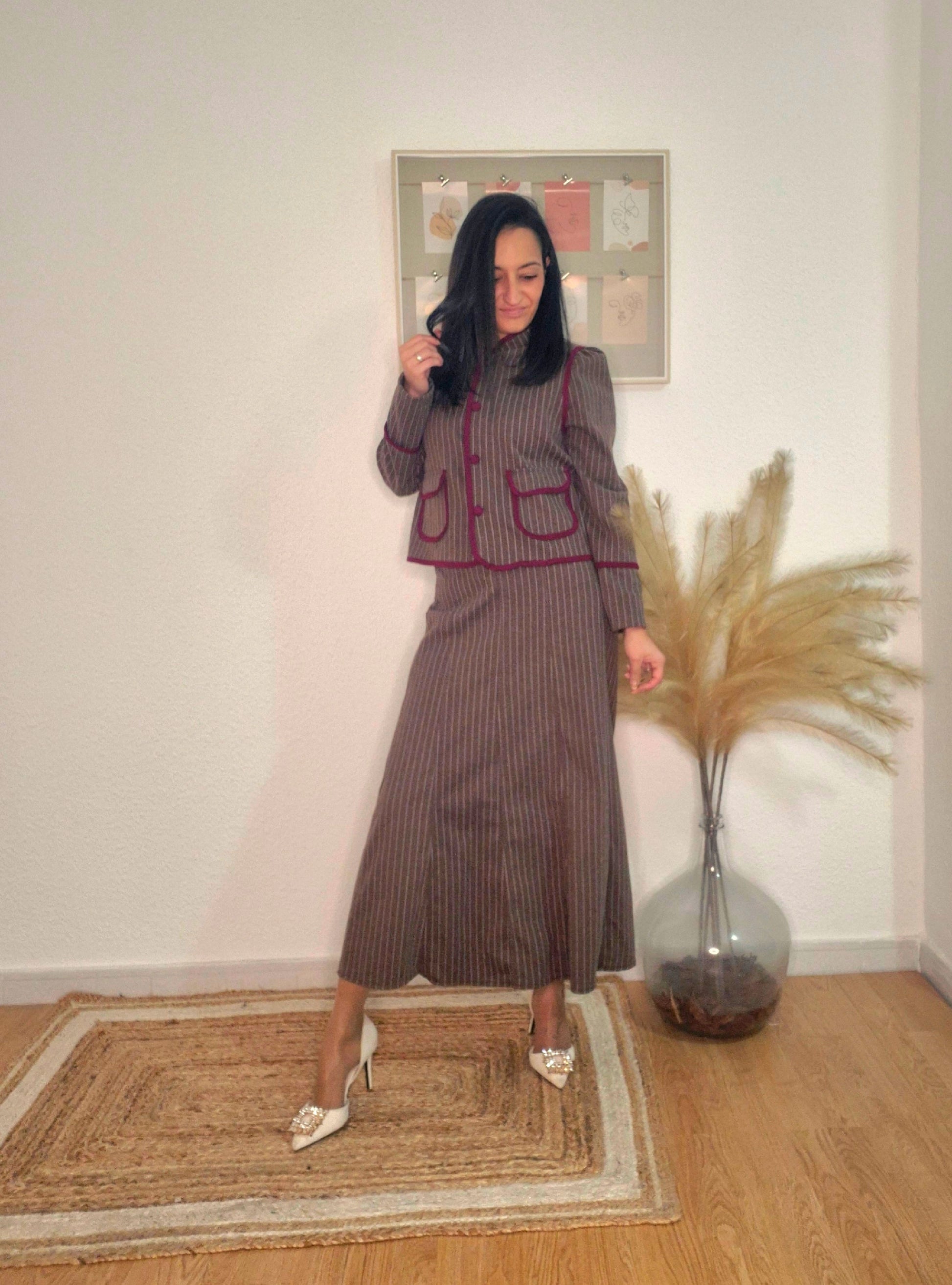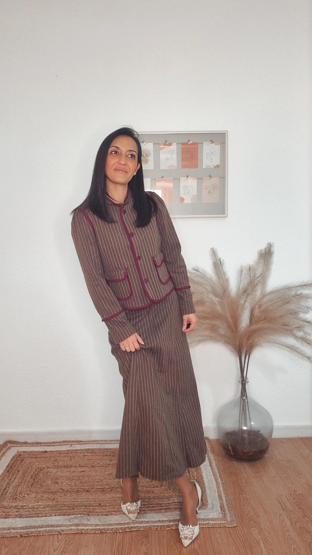 Elegancia atemporal en dos piezas: Chaqueta corta y falda midi fluida.