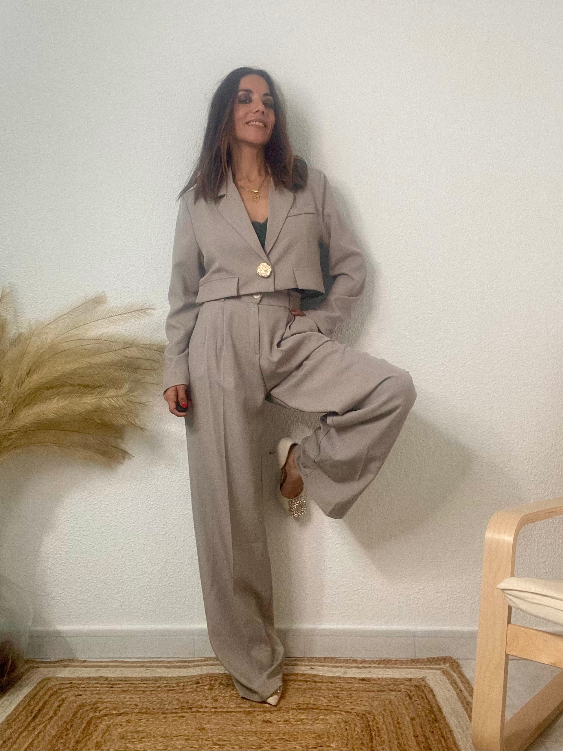 Un conjunto dos piezas en color taupe con alma urbana y espíritu refinado. El blazer cropped con botón dorado resalta la cintura y aporta equilibrio, mientras que el pantalón palazzo da movimiento y comodidad.