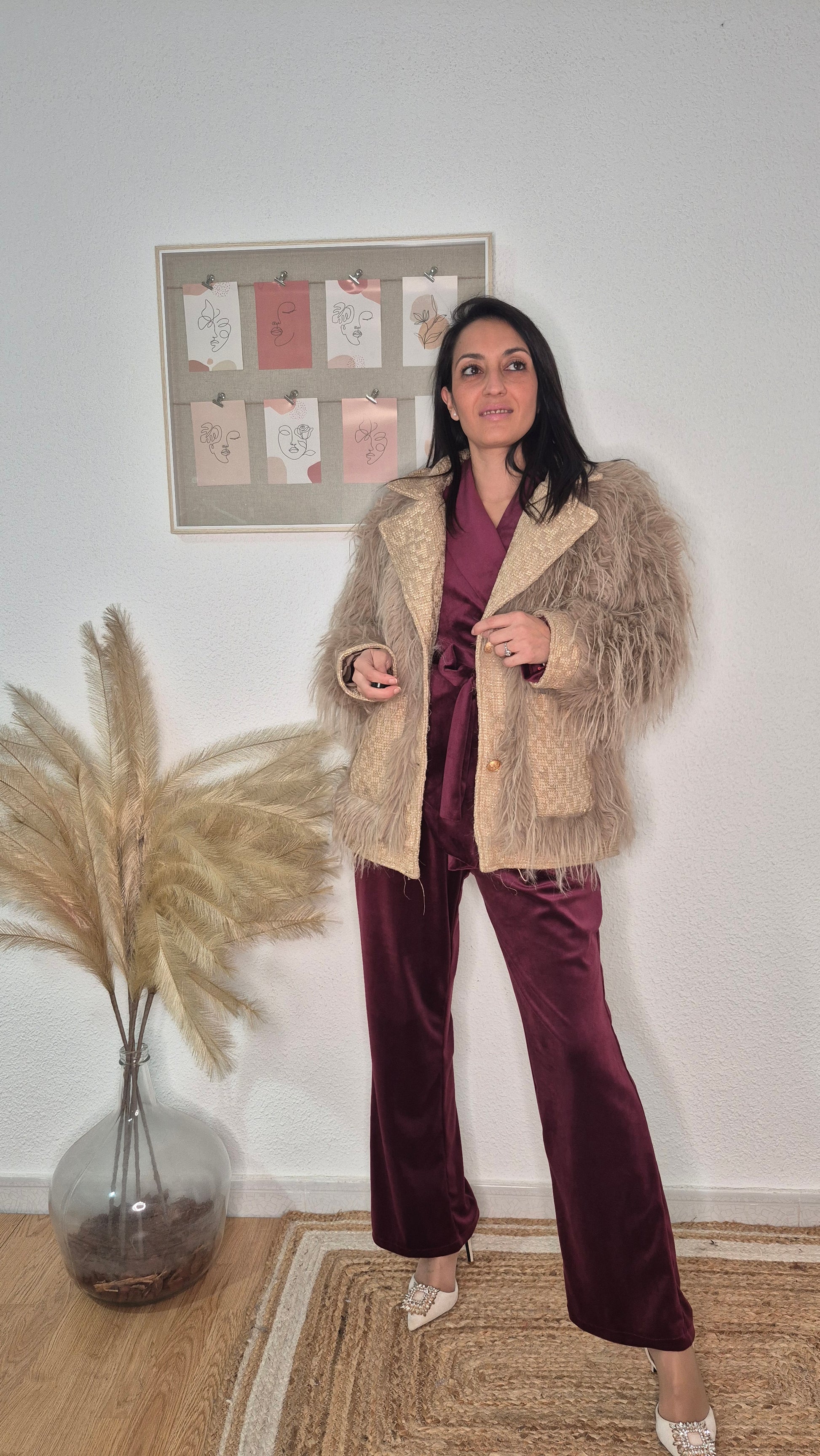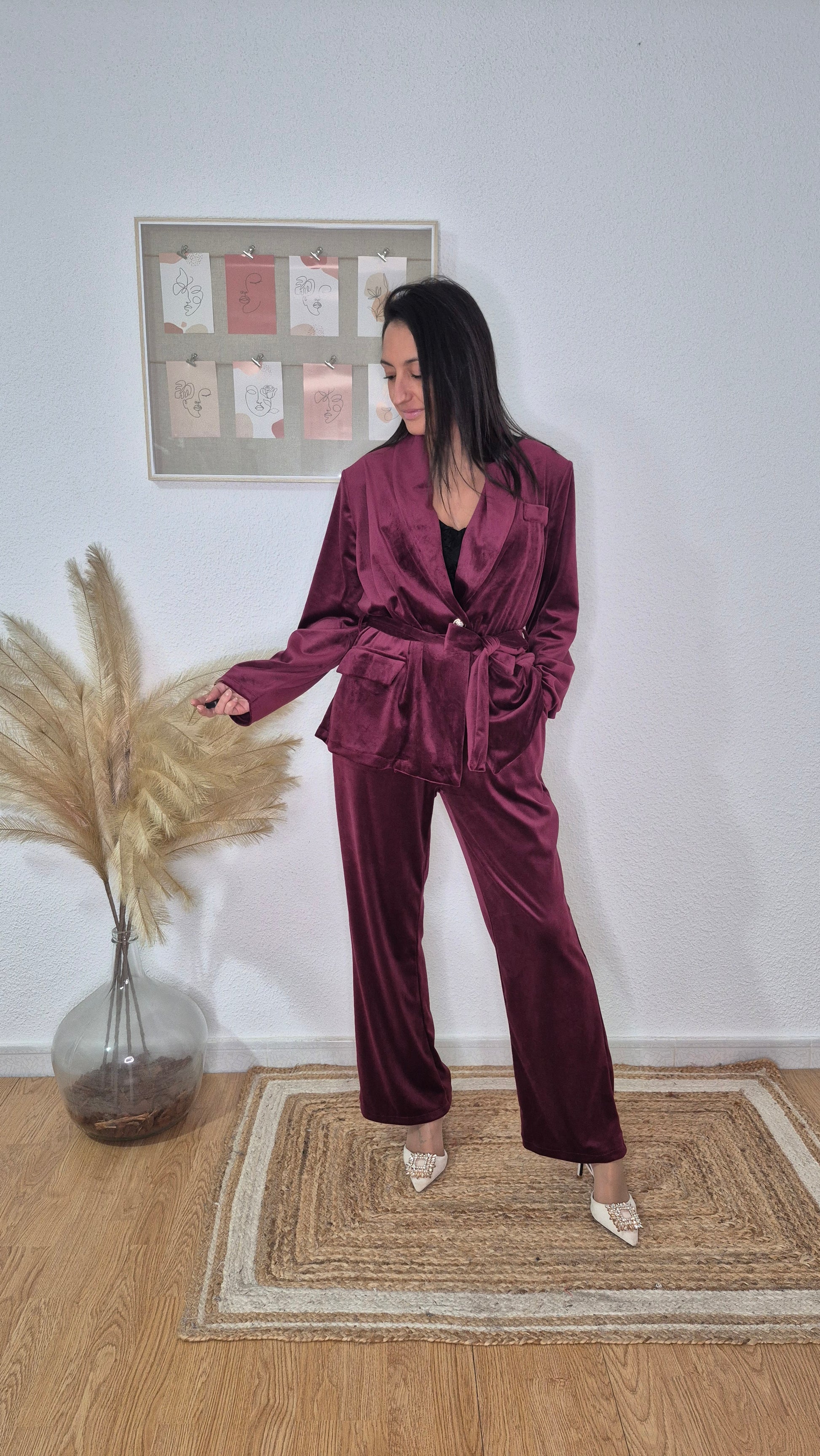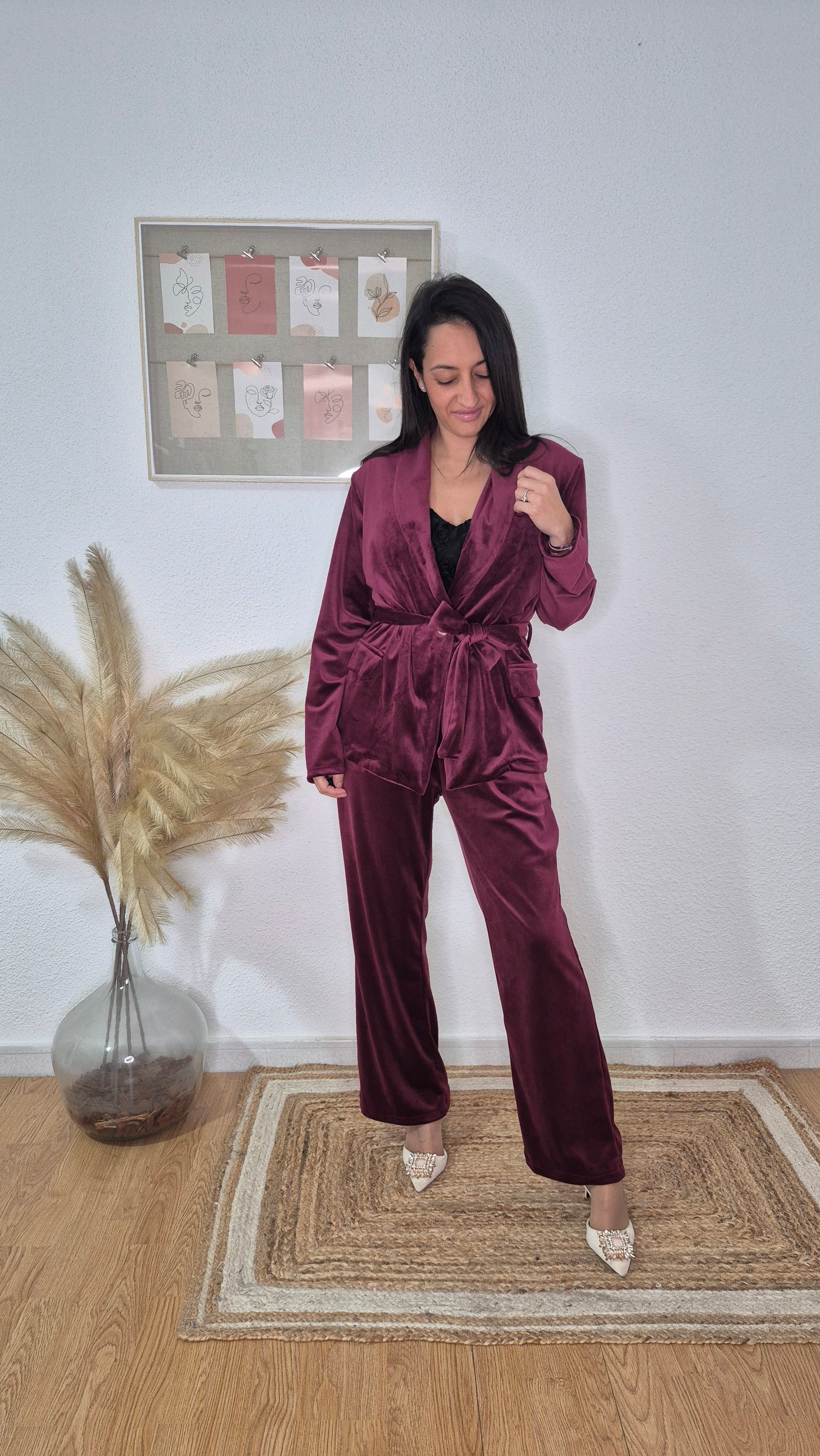 Este conjunto es puro “wow”. El terciopelo en burdeos tiene una caída preciosa y ese brillo justo que levanta cualquier look. La chaqueta estiliza y el pantalón es comodísimo. Perfecto para cuando quieres sentirte arreglada, cómoda y con un toque muy chic.