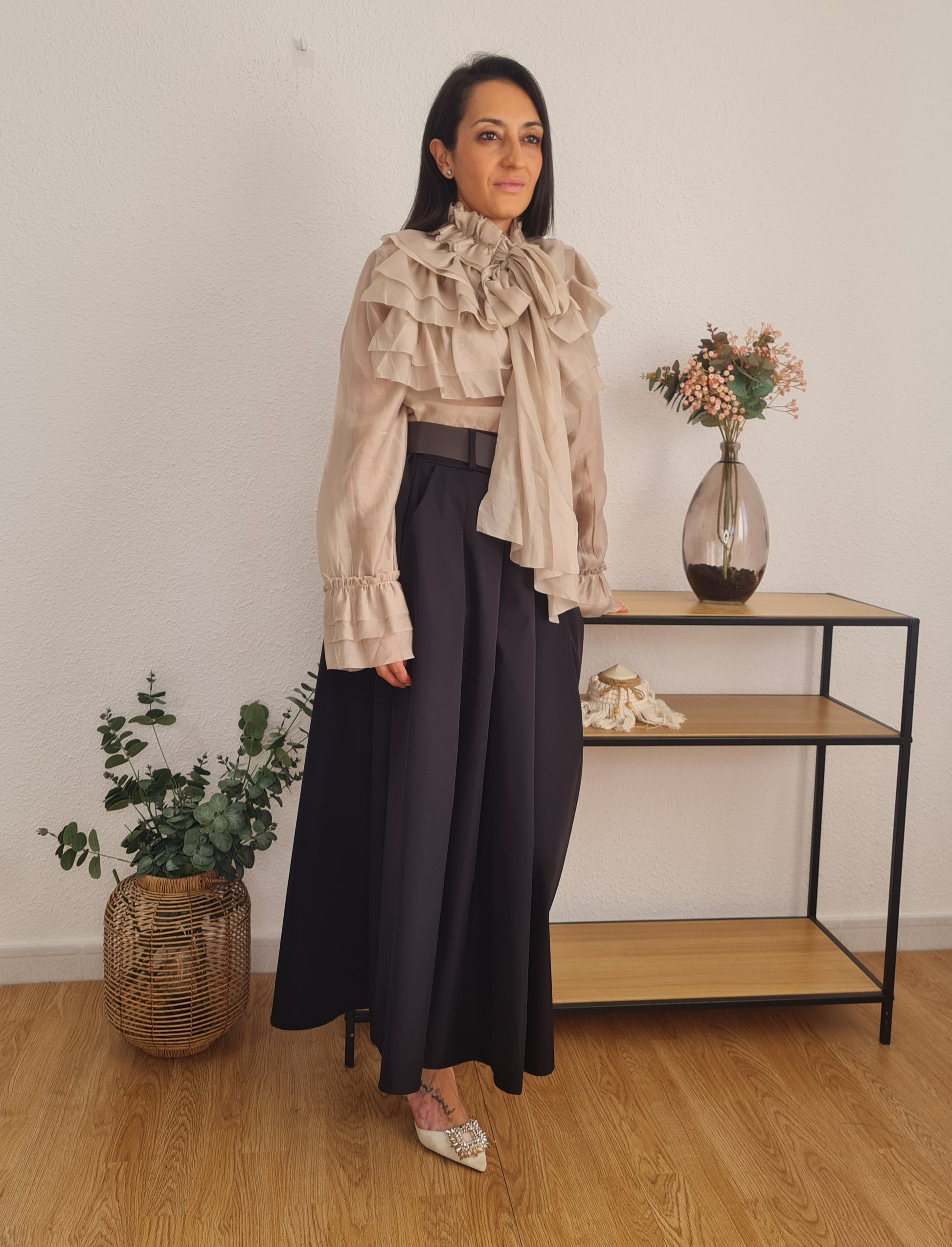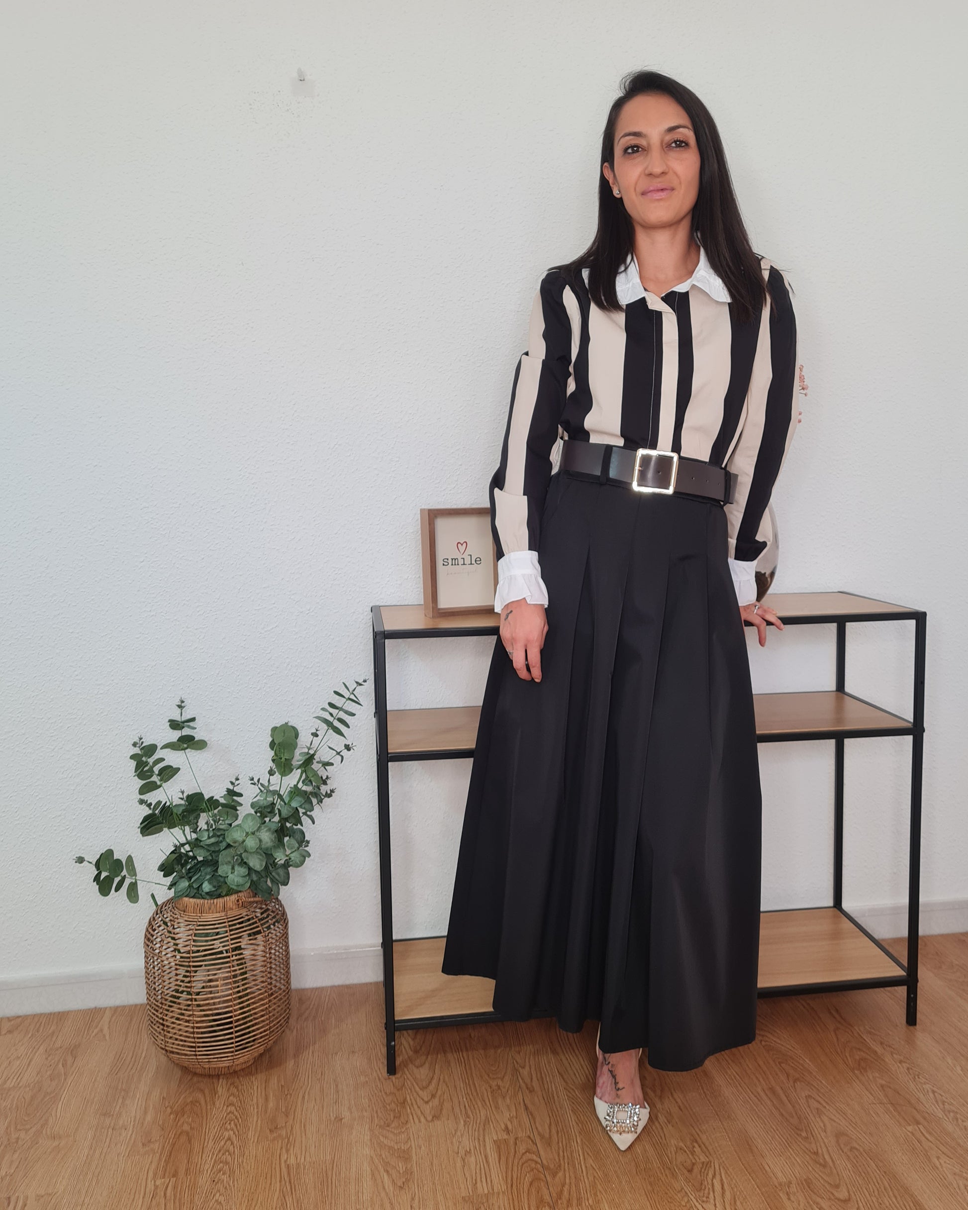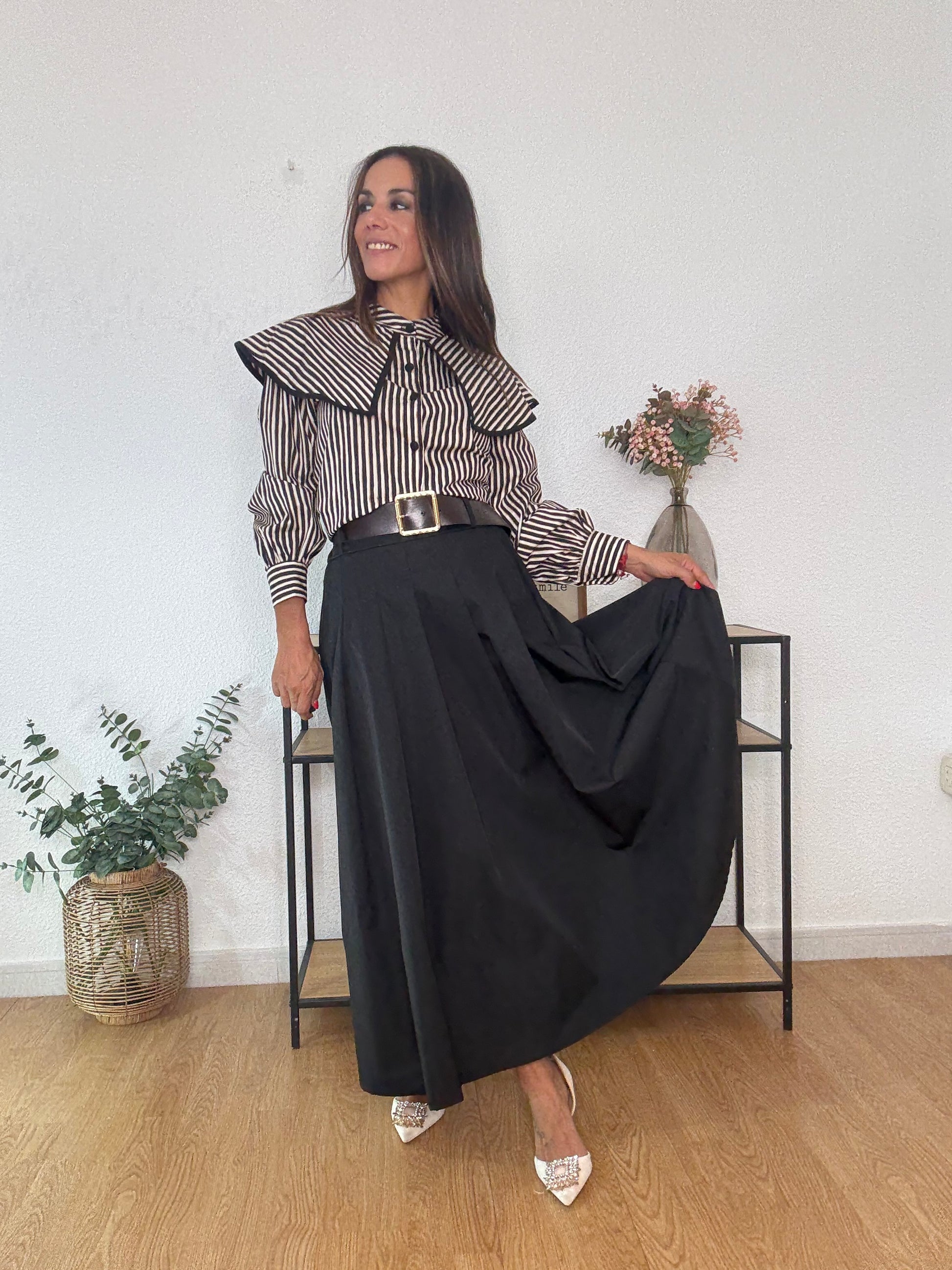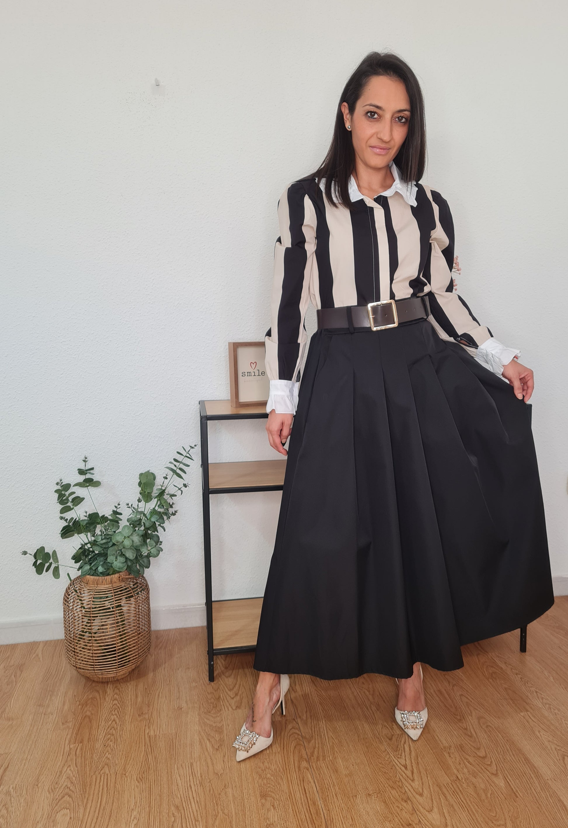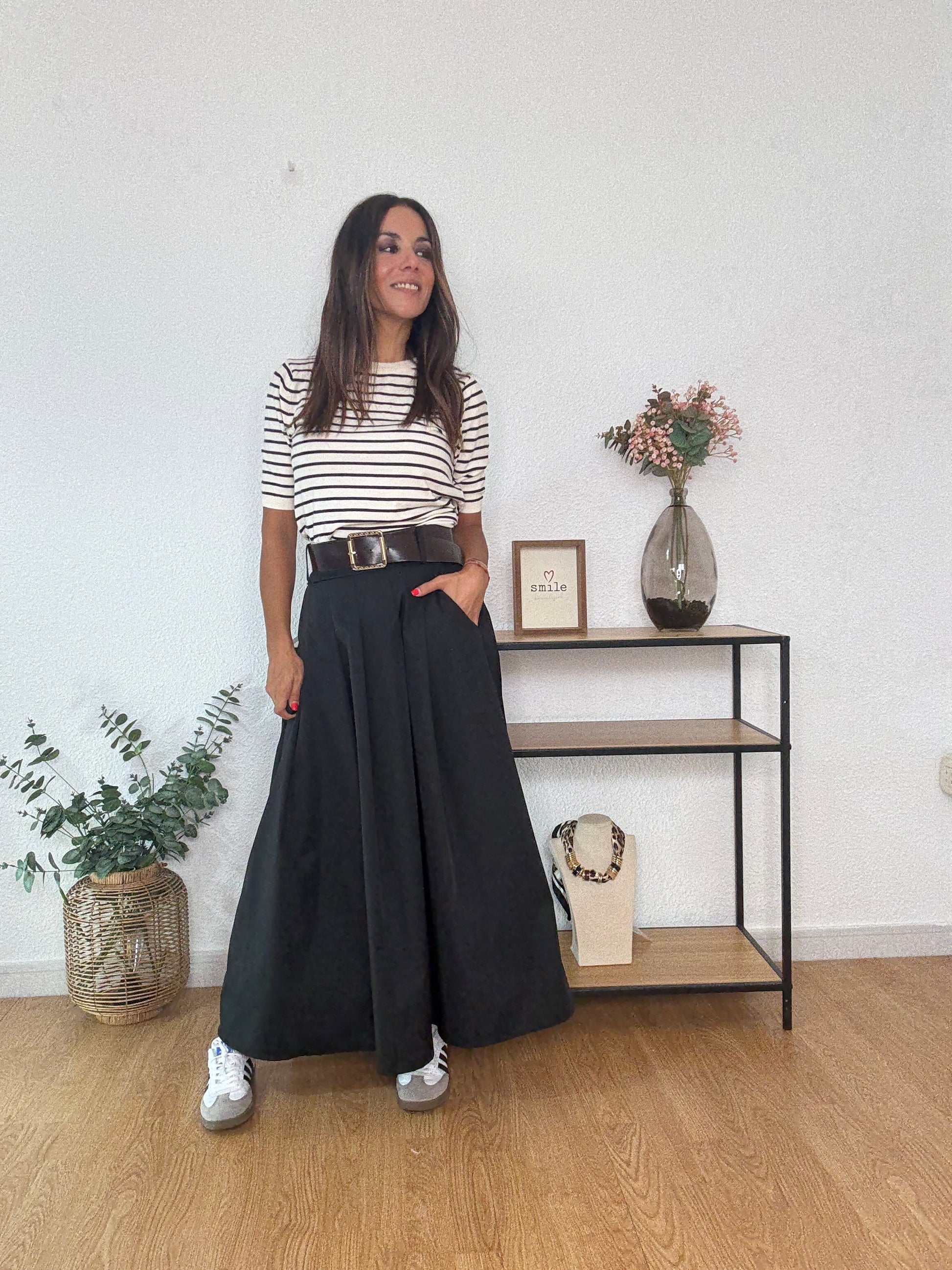 La falda Amberes está confeccionada en tela de gabardina, con un corte midi amplio y elegante que aporta movimiento y sofisticación a cada paso. Incluye bolsillos y cinturón que realza la cintura y estiliza la silueta. Una prenda versátil que puedes llevar con camisa y tacones para un look de impacto, o con camiseta marinera y sneakers para un estilo effortless chic.