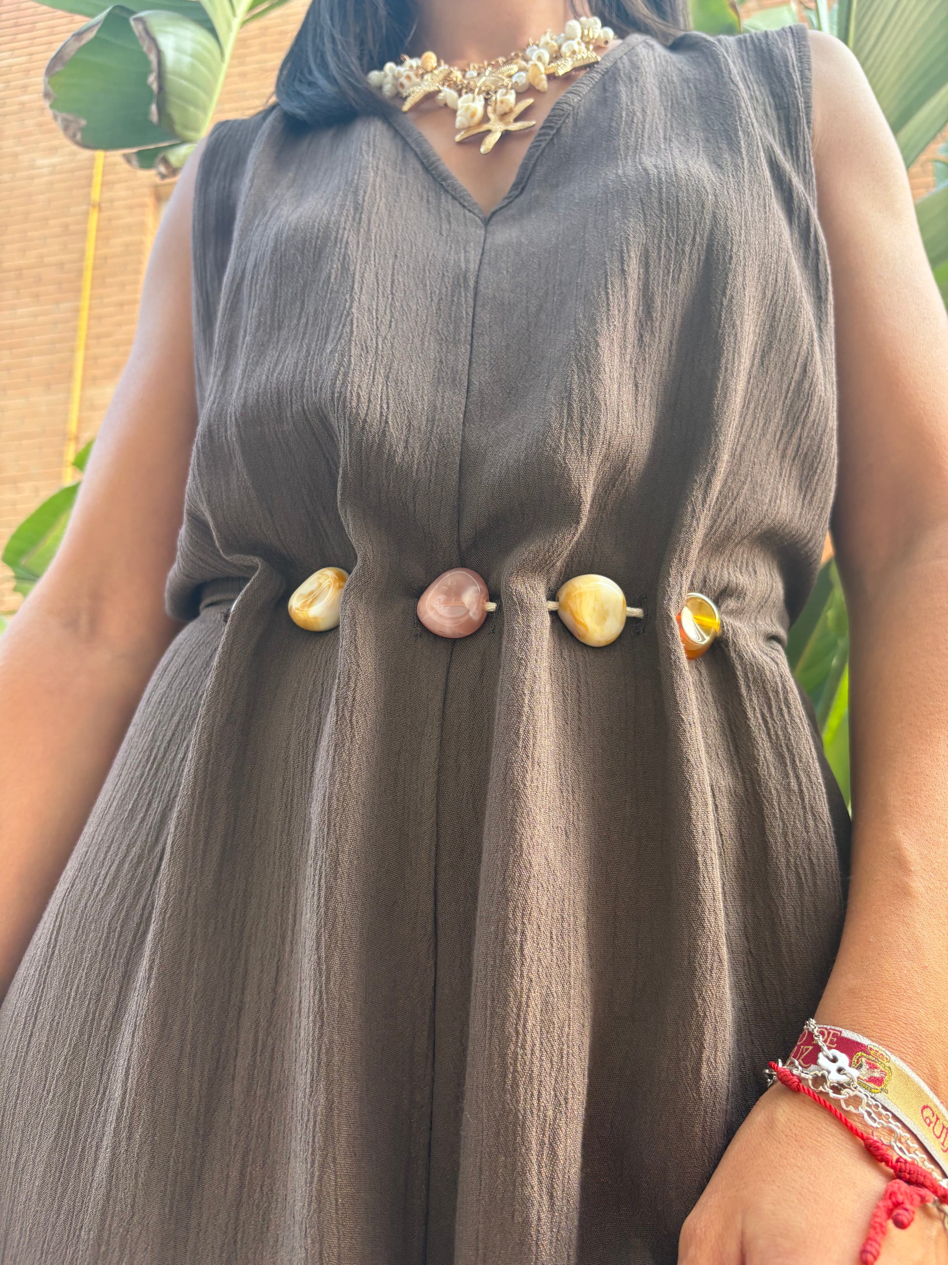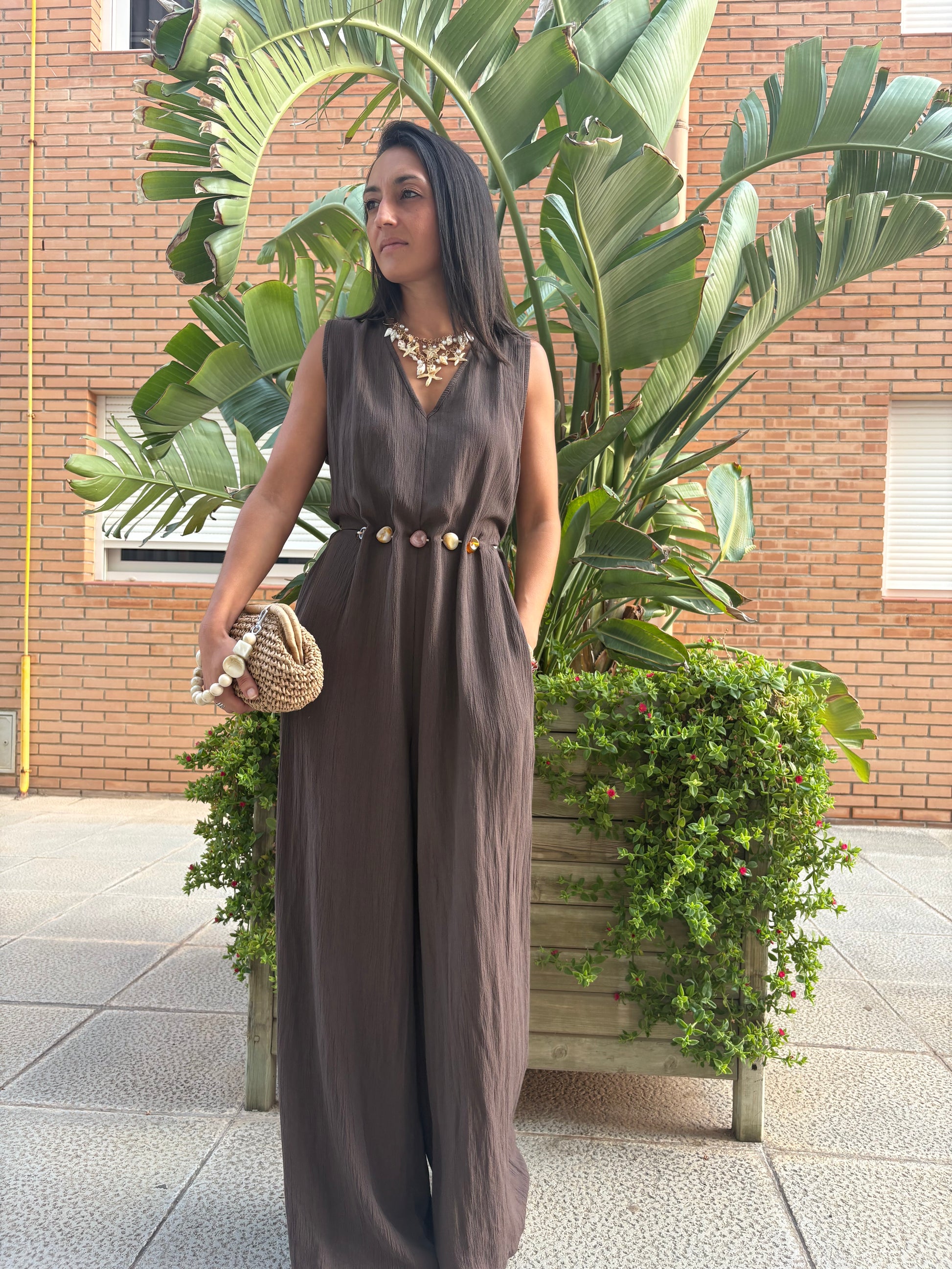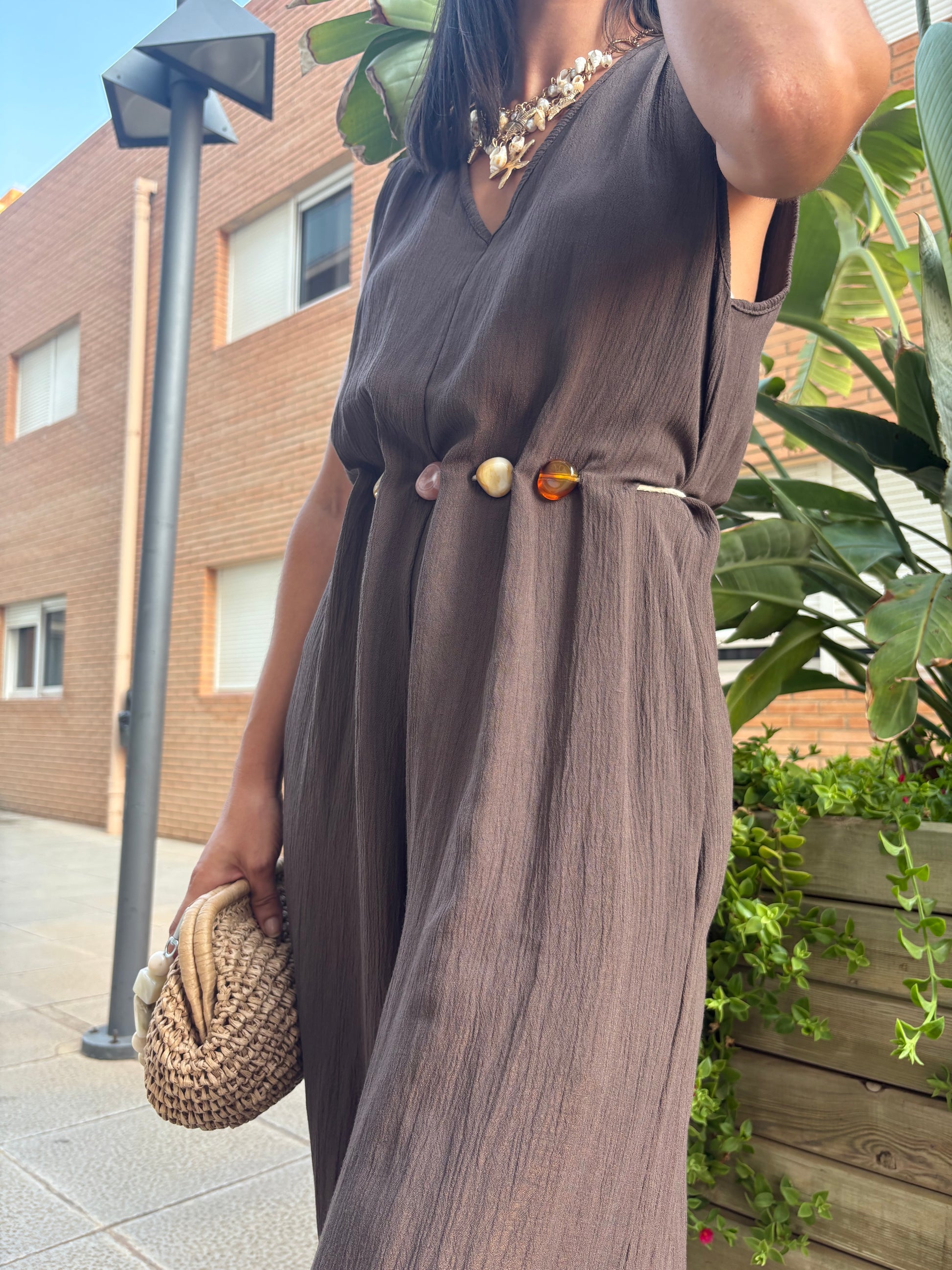 Mono largo en tono marrón, confeccionado en tejido ligero y fluido. Su diseño destaca por el cinturón integrado adornado con conchas y piedras naturales, que aporta un toque artesanal y veraniego. Ideal para un look fresco, elegante y cómodo, desde un paseo costero hasta una cena al atardecer.