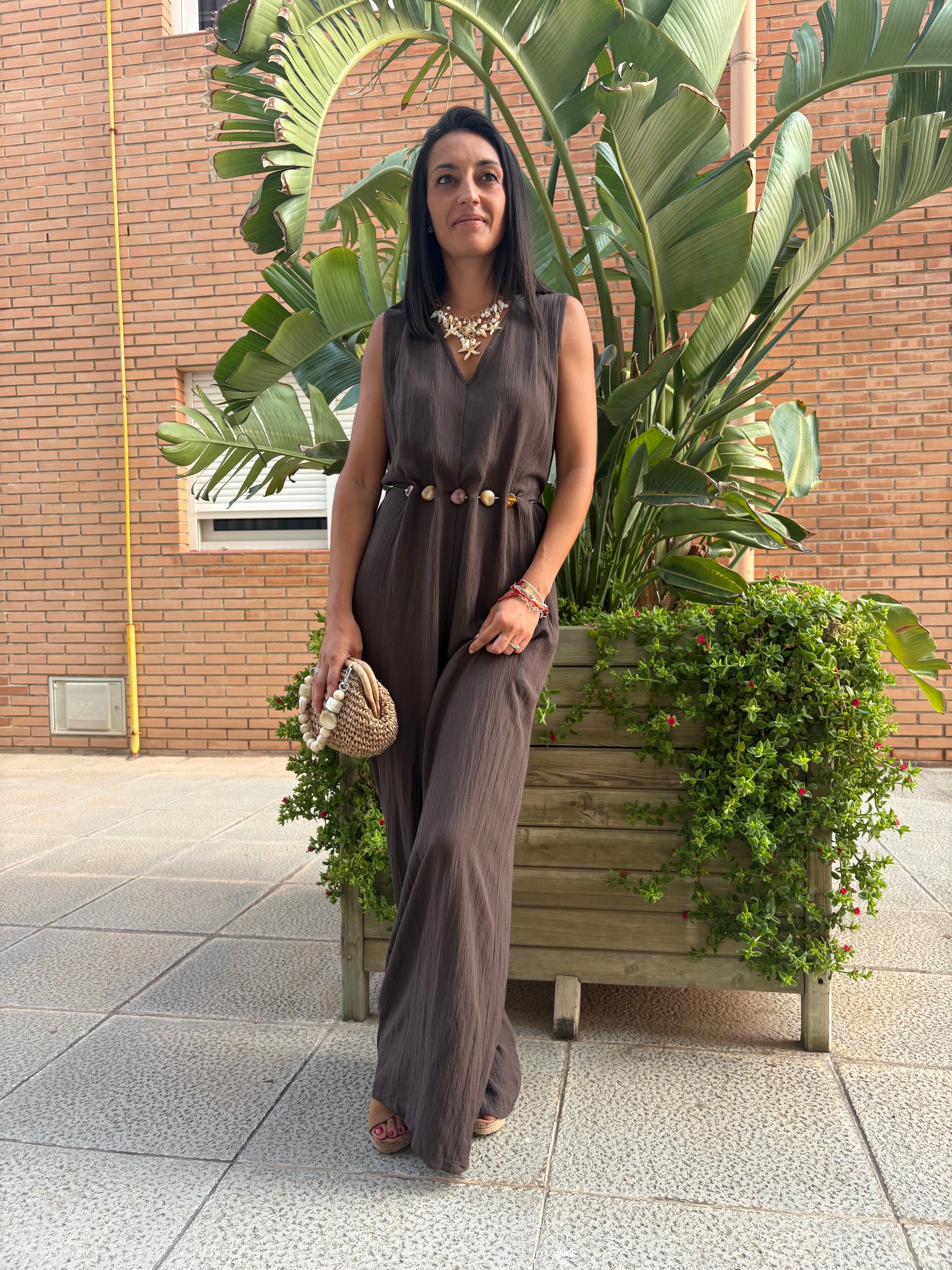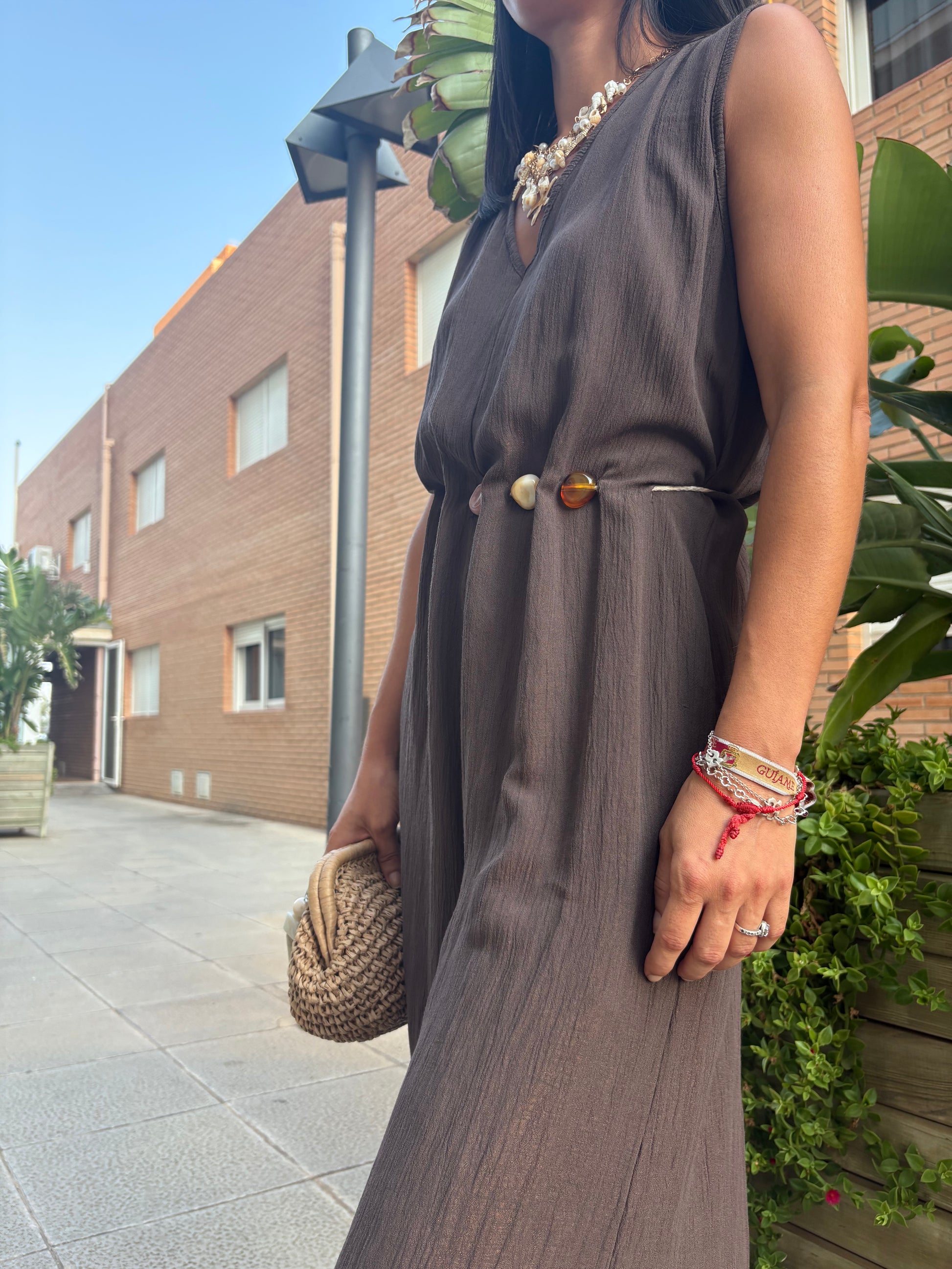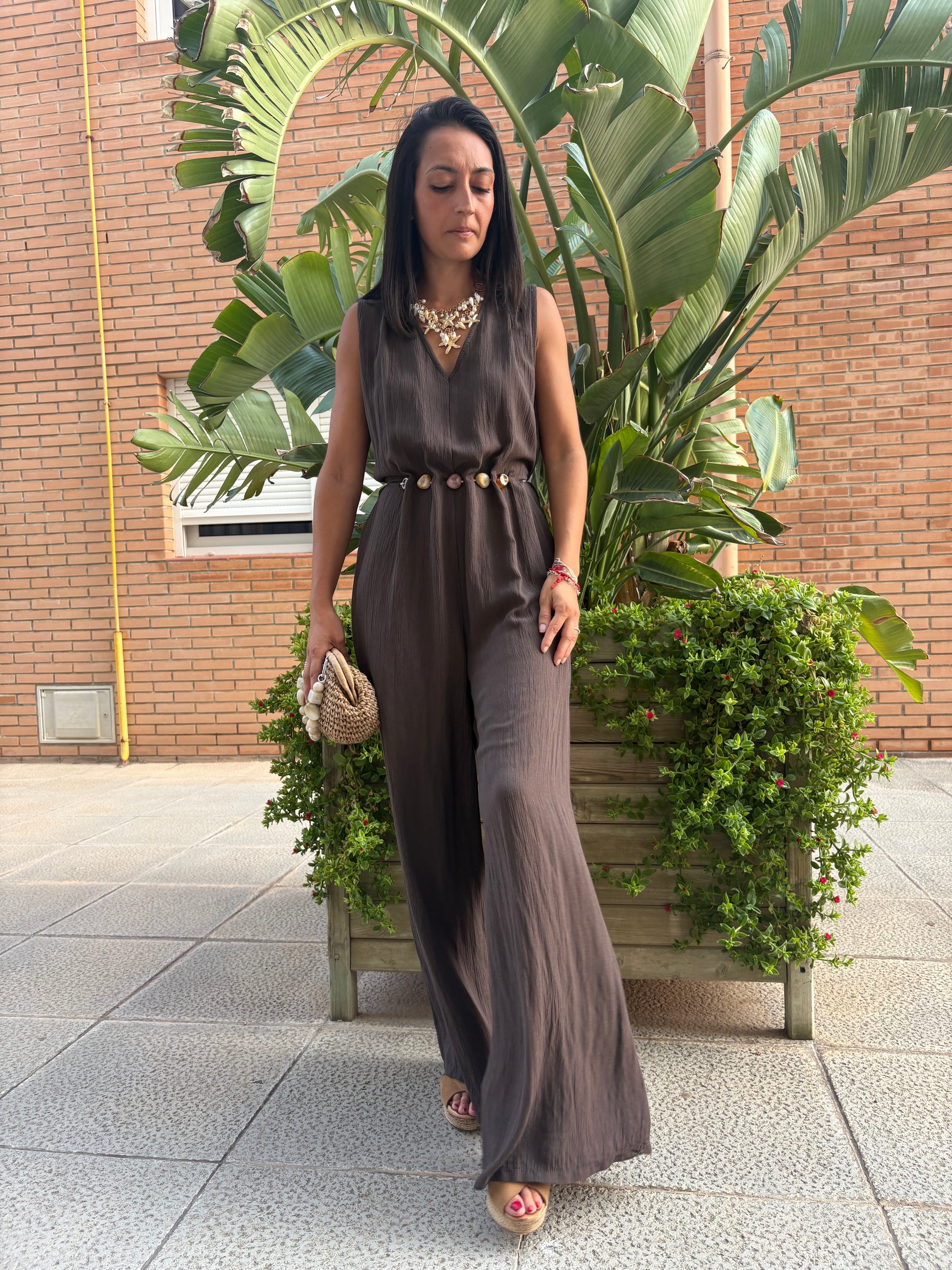Mono largo en tono marrón, confeccionado en tejido ligero y fluido. Su diseño destaca por el cinturón integrado adornado con conchas y piedras naturales, que aporta un toque artesanal y veraniego. Ideal para un look fresco, elegante y cómodo, desde un paseo costero hasta una cena al atardecer.