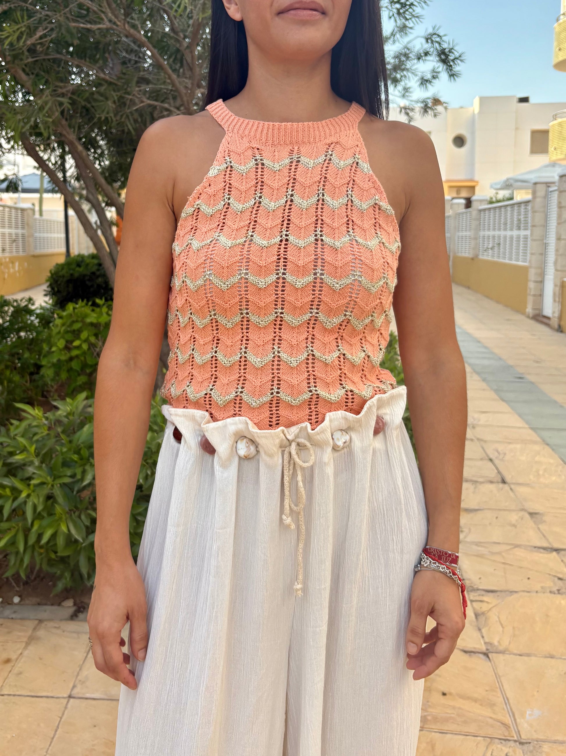 Top calado coral con hilos dorados y escote halter. Ligero, chic y perfecto para brillar en tus días de verano🌞