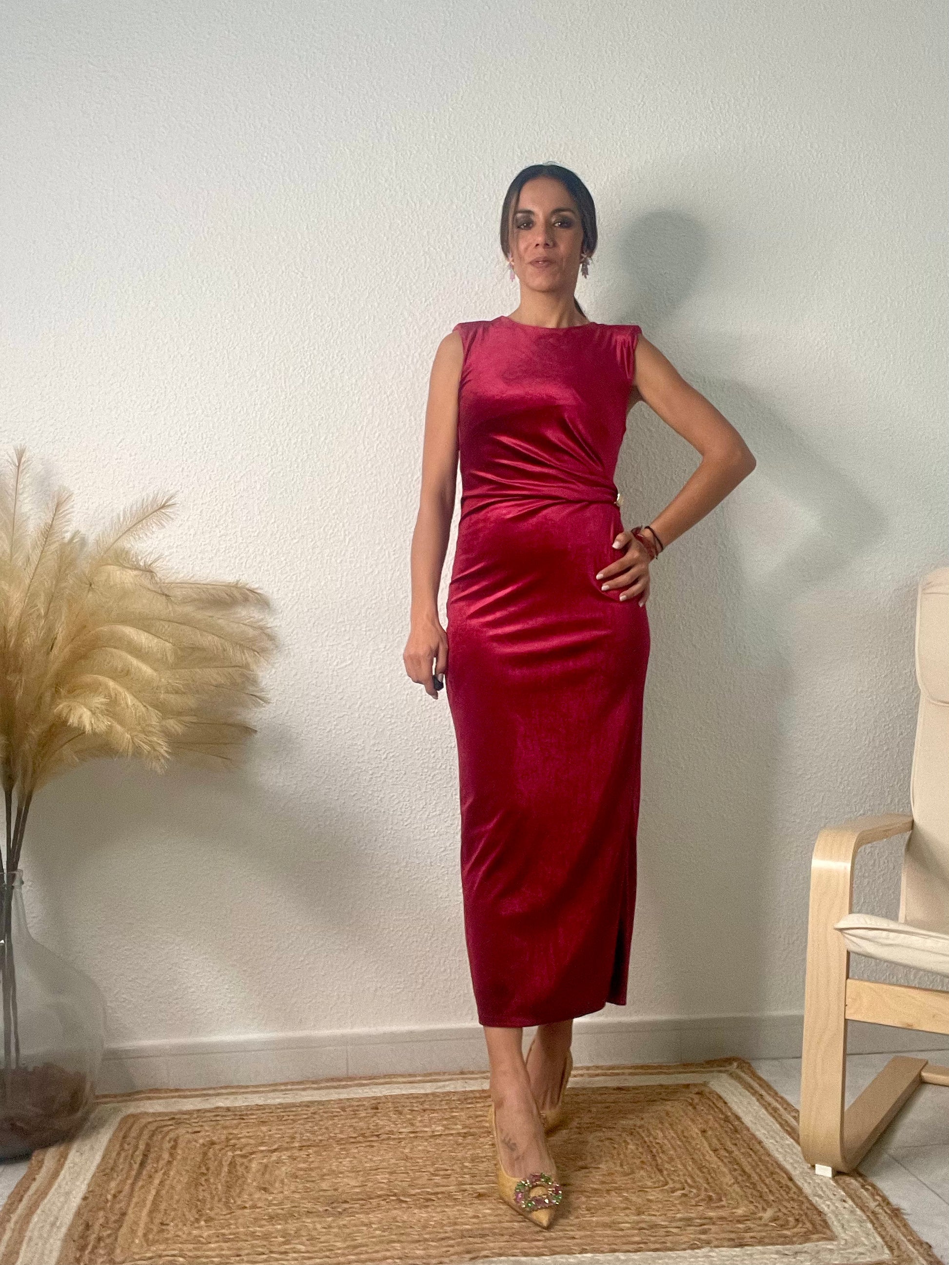 Vestido terciopelo en color burdeos con cintura fruncida y detalle de hebilla dorada. Corte MIDI y pequeña abertura en la zona trasera.